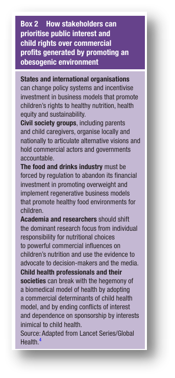 The authors outline the contributions of the FDI’s marketing practices, financial models and tactics to block market regulation, to wider commercial determinants of child health. The role of the obesogenic environment on children in their early years in shaping later risk of non-communicable diseases is outlined, and the multitude of ways the FDI violates children’s rights is described. The authors highlight key actions Governments can take to transform children’s food environments for the better, including implementing the International Code of the Marketing of Breastmilk Substitutes and enacting legal measure to limit the availability, marketing and purchase of unhealthy foods and drinks and concomitant measures to enable improved availability and affordability of locally produced nutritious foods for children. Of most relevance to readers of this newsletter, they also outline how other stakeholders including civil society groups, academics and child health professionals can exert positive pressure to improve the obesogenic environment, as shown in box 2.