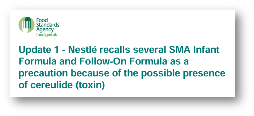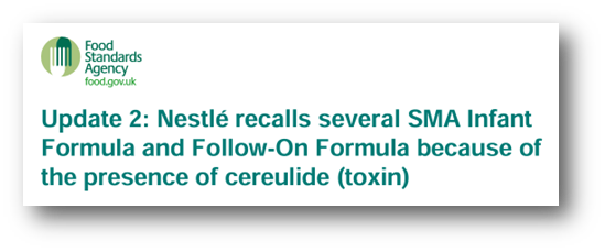 3rd of February: Update 2: Nestlé recalls several SMA Infant Formula and Follow-On Formula because of the presence of cereulide (toxin) | Food Standards Agency