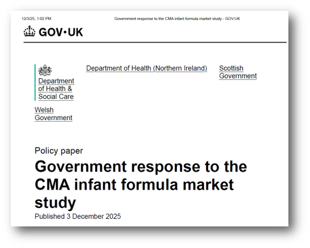 On 3 December 2025, the Government published its joint response to the Competition and Markets Authority (CMA) infant and follow-on formula market study. The joint response was compiled by the UK, Scottish and Welsh governments (including the Department of Health and Social Care (DHSC), Public Health Scotland, Public Health Wales), Food Standards Scotland, and the Department of Health and Food Standards Agency in Northern Ireland.