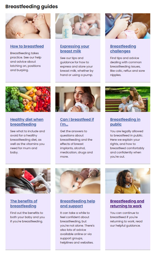 A comprehensive selection of knowledge and guidance for breastfeeding families, providing NHS-trusted advice on topics such as expressing breastmilk, breastfeeding in public, maintaining a breastfeeding-friendly diet, the many benefits of breastfeeding, returning to work while breastfeeding, and many more. These can be found here.